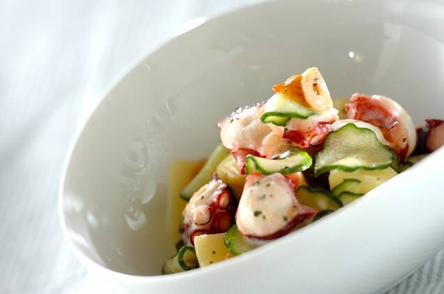 すりおろしたきゅうりとゆでタコを和えた、ぱぱっとつくれる一品です。味つけはしょうがのせん切りとポン酢しょうゆのみなので、面倒な調味料合わせも不要で、だれでも簡単につくれます。