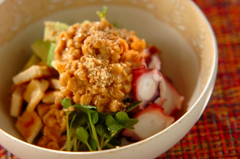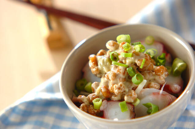冷蔵庫に常備してあることの多い納豆と、タコを合わせてアレンジしたレシピです。ワサビとマヨネーズで味つけをしたピリ辛風味と、タコのコリコリとした食感を楽しめます。