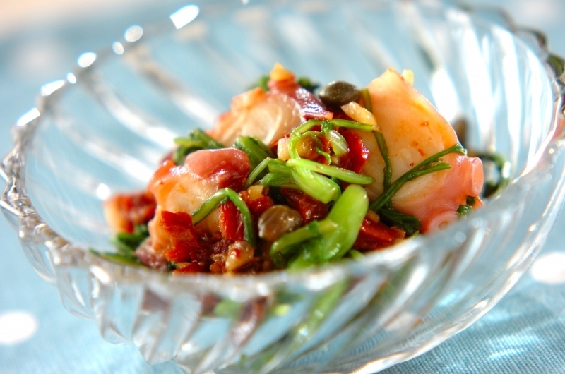 たこと春菊をつかったイタリアン風な味つけの和え物です。トマトはドライトマトを使うことで、トマトの凝縮した旨味が感じられるだけでなく、水っぽくならないので、よりおいしくいただけます。