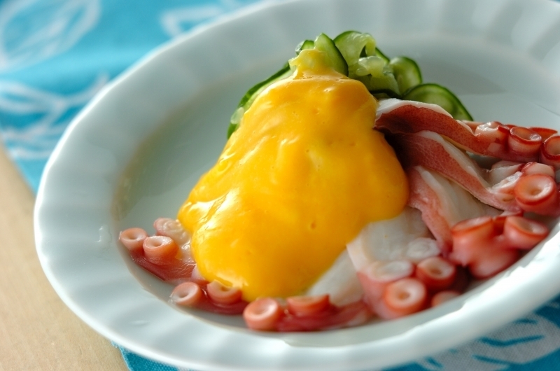 濃厚でコクのある黄身酢をかけたタコときゅうりの酢の物です。タコときゅうりはそれぞれ薄切りにすることで、黄身酢がからみやすく、食べやすくなります。
