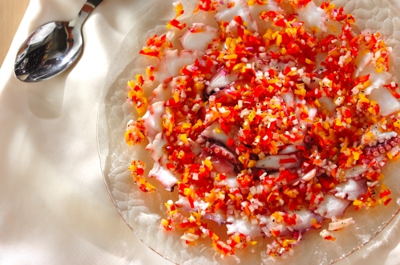 色鮮やかなパプリカのソースをまとった、さっぱりおいしいタコのカルパッチョ風な一品です。タコは切って盛りつけるだけのゆでだこを使うことで、手間をかけずに簡単につくれます。