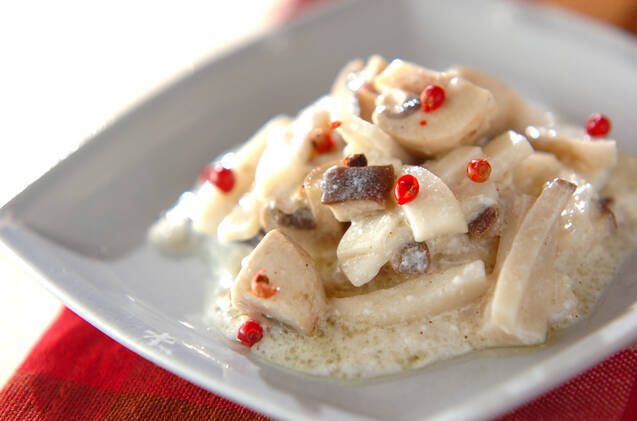 サッパリとしたサラダを食べたいなら、きのこのヨーグルトサラダがおすすめ。ゆでたエリンギとマッシュルームをヨーグルトで和えるだけの簡単レシピです。ピンクペッパーで彩りをプラス。