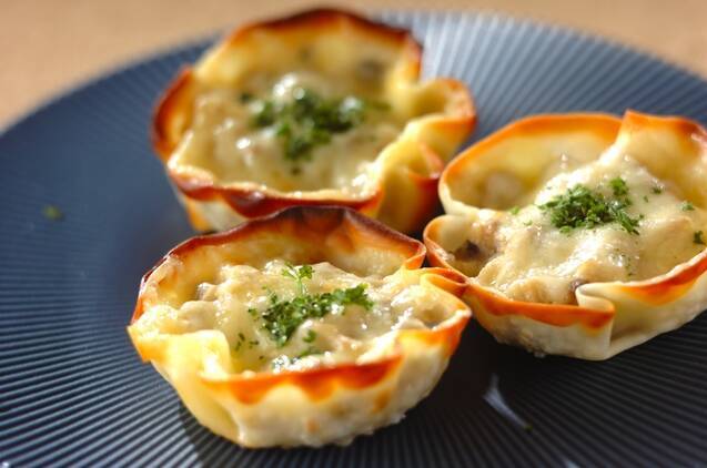見た目がかわいい、マッシュルームの一口ピザです。マフィンカップなどの型に入れて焼くと餃子の皮がカップ型に変身。あまってしまった餃子の皮を消費したいときに役立つレシピです。