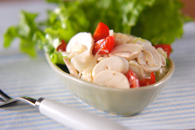 マッシュルームとセロリを使った、歯応えがたのしいサラダのレシピです。彩りも美しく、ホタテ缶をプラスして旨味をアップさせているので、サラダが苦手な人でもおいしくいただけます。