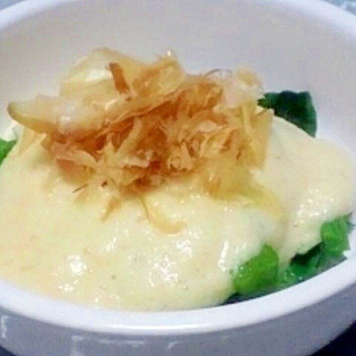 ゆでたツルムラサキに、ふわふわにおろした山芋をたっぷりかけた一品。山芋をおろすときに麺つゆを入れているので、しっかり味がついています。かつお節をのせたら完成です。