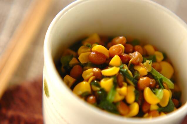 納豆にツルムラサキやトウモロコシを合わせて、ひと手間加えたレシピ。ネバネバやプチプチなど、いろいろな食感を楽しめます。手軽に栄養補給できるのもうれしいポイントです。