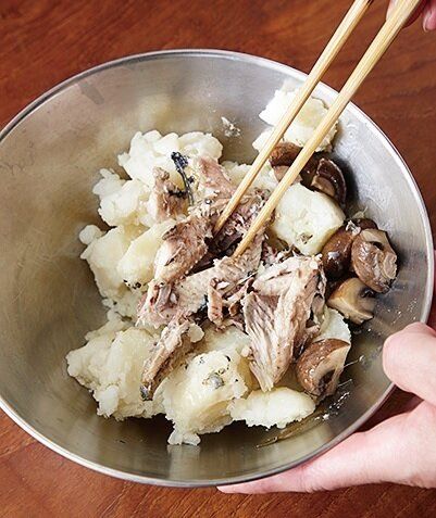 ゆでたじゃがいもにいわしをくずしながら混ぜて、マヨネーズを塗ったパンにはさめばサンドイッチに。じゃがいも2個につき、いわしのオイル煮1人分が目安。