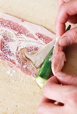 豚肉を広げ、薄力粉を薄くふり(内側になる面に)、手前にオクラ1本とエリンギ1切れをのせて巻く。ぎゅっと握って肉をくっつける。