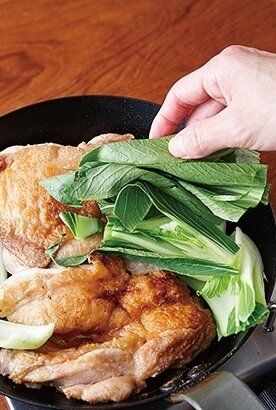 裏返して弱火にし、フライパンの空いている所に青梗菜を入れて約8分焼き、中まで火を通す。[A]は混ぜておく。中火に戻して[A]を加え、煮立たせながらからめる。鶏肉を食べやすい大きさに切って青梗菜とともに器に盛り、汁をかける。