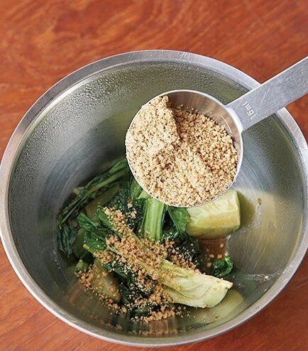 べんとうに入れるときは、青梗菜にはすりごまをまぶす。ごまが汁けを吸うので汁漏れ防止に。