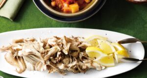 鶏肉は皮目に薄力粉をはたく。青梗菜は縦に6等分に切り、長さを3等分に切る。