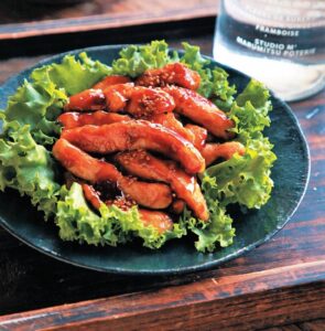 (3)(1)のソースを加え、弱めの中火でとろみがつくまで煮る。器に盛り、あれば青じそをのせる。