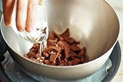 (1)ボウルにチョコレートとサラダ油を入れて湯せんにかけ、ゴムべらで混ぜて完全に溶かす。