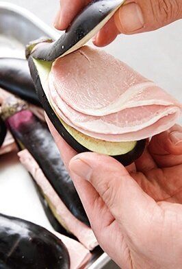 なす1切れに、ハム2枚を重ねて半分に折りたたんではさむ。小麦粉、溶き卵、パン粉の順にころもをつける。