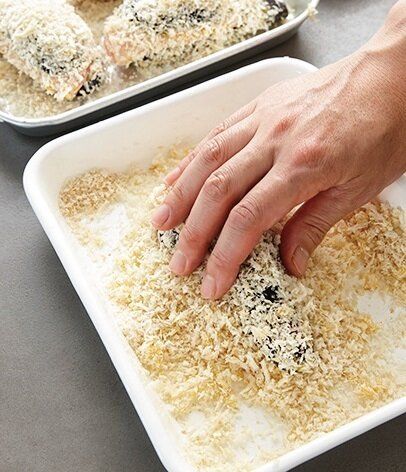なすの皮の面は、パン粉がはがれやすいので、手でやさしく押さえてつける。