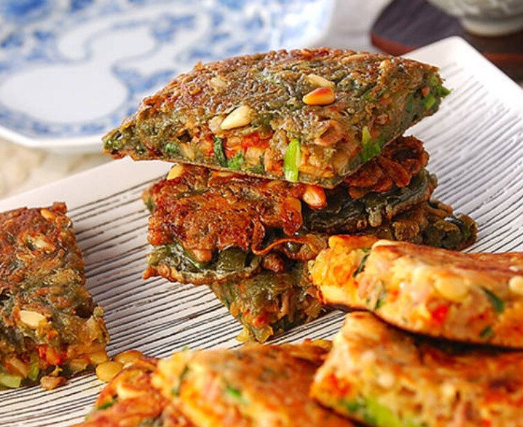 プレーンタイプとよもぎ入り、2種類のチヂミブレンド粉を使った、鮮やかなパジョン風お焼きのレシピです。生地と豚肉の炒め物との相性もよく、メインにもおつまみにもなる一品です!火力を強めて、外側はパリッと仕上げるのがおすすめですよ。