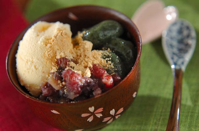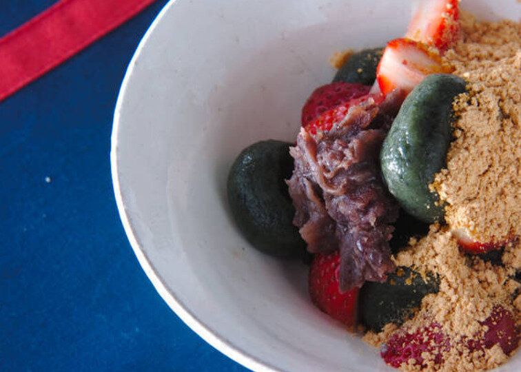 乾燥よもぎを混ぜ込んで小さく丸めた草もち団子に、あんこときなこをかけたレシピ。おもてなしとして振る舞っても喜ばれる、上品な一皿です。あんこを包んで草もちにしたり、和菓子店のように串に刺したりしても◎。