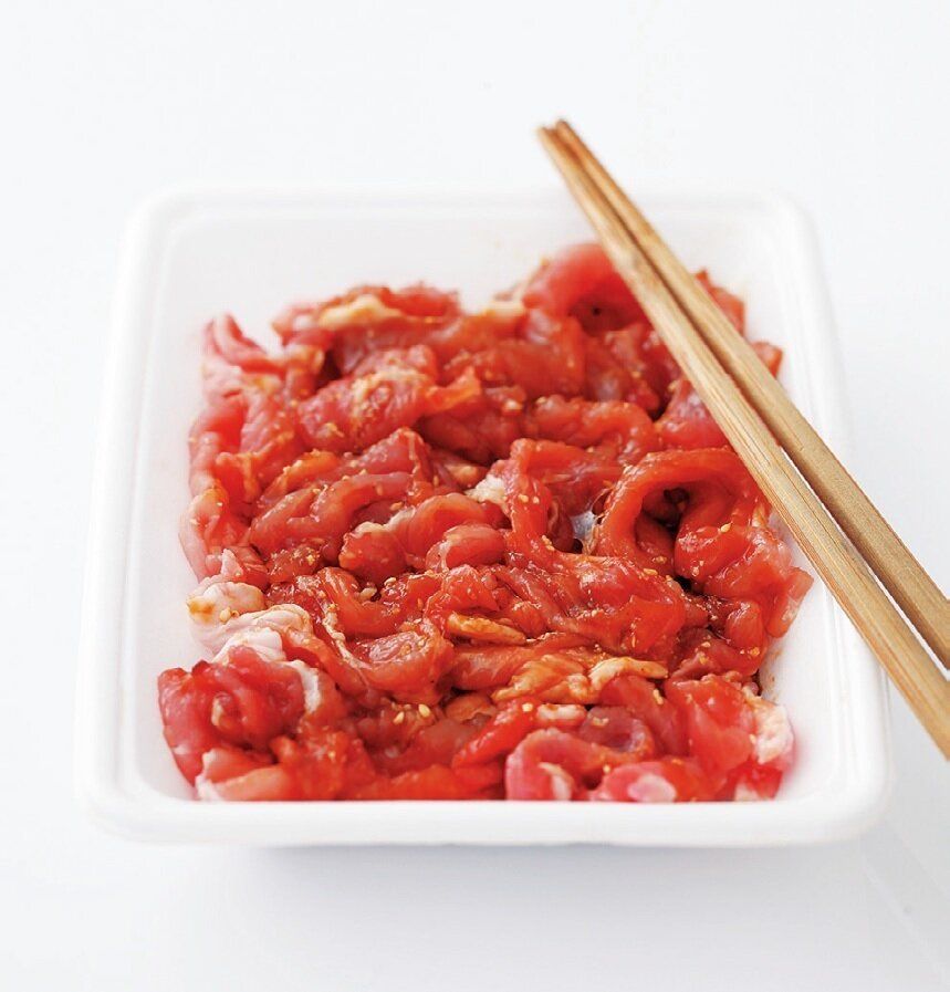 肉をまな板にのせて包丁で切り、ボウルに入れて味つけして……、どひゃー、手間がかかりすぎ!それなら肉が入っていたトレーの上ではさみで切り、下味までつけちゃえばいい!余計な洗い物がなくなります。