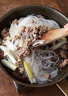 フライパンを中火で熱し、ごま油を入れ、ひき肉を入れて炒める。肉の色が変わったらねぎ、水けをきって長ければ食べやすく切った春雨を加えて炒める。