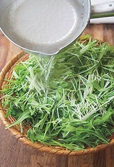 水菜は根元を落とし、長さ4~5cmに切ってたっぷりの水で洗い、盆ざるなどに広げる。たっぷりの熱湯を全体にかけて、上下を返してさらにかけ、そのまま粗熱を取る。