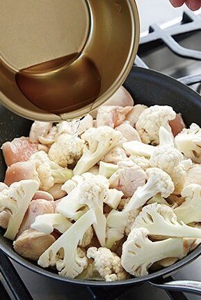 フライパンにサラダ油を熱して鶏肉、カリフラワーをさっと炒める。酒を加え(写真)、ふたをして、3分ほど蒸し焼きにして塩、黒こしょう各少々をふって耐熱皿に入れる。