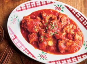 「鶏肉が焼けてきたらトマト缶を投入!」。
