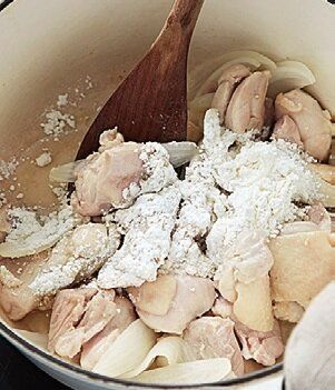 鶏肉の色が変わったところに小麦粉を入れて炒めてから煮ると、とろみがつく。