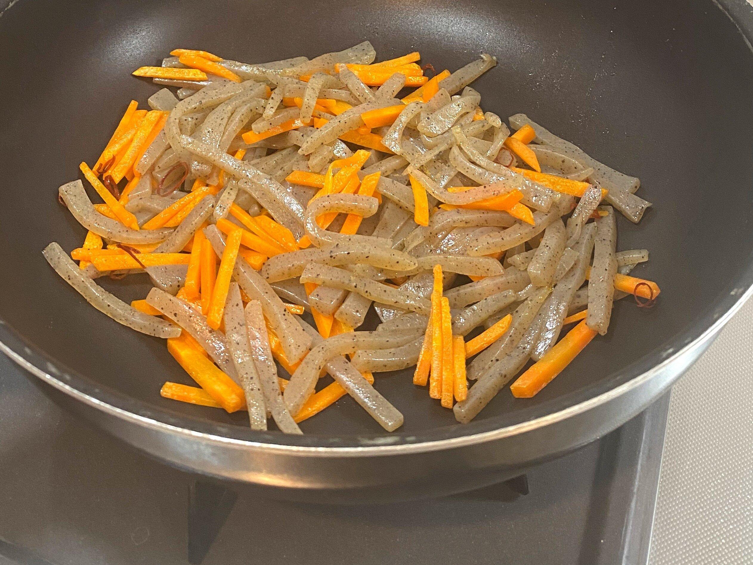 2、フライパンにごま油、鷹の爪、にんじん、下茹でした蒟蒻を入れ、蒟蒻の水分を飛ばすように炒める。