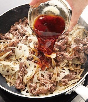 根菜、牛肉の順に入れて炒め、牛肉の色が変わったら調味料を加えると味がよくしみ、しっとりしたきんぴらに。