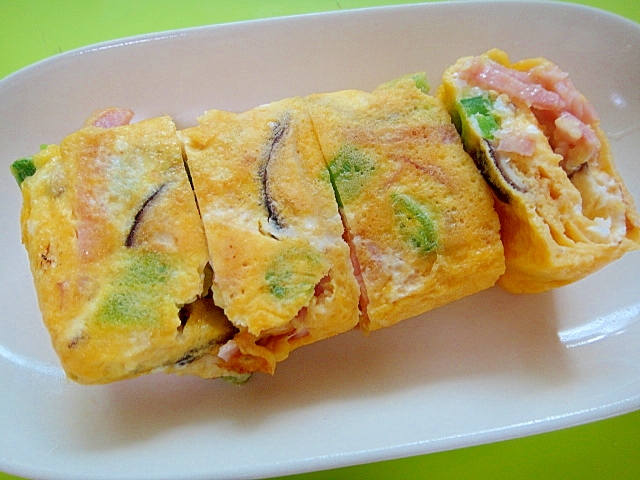 スナップエンドウと椎茸ベーコンの卵焼き