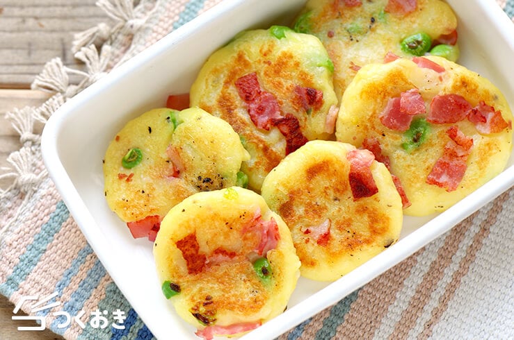 子どものおやつにもぴったりな、枝豆ベーコンのじゃがいももち。ベーコンのほどよい塩味と、枝豆の食感を楽しめます。じゃがいもを電子レンジで長めに加熱して、なめらかにつぶすのがポイントです。