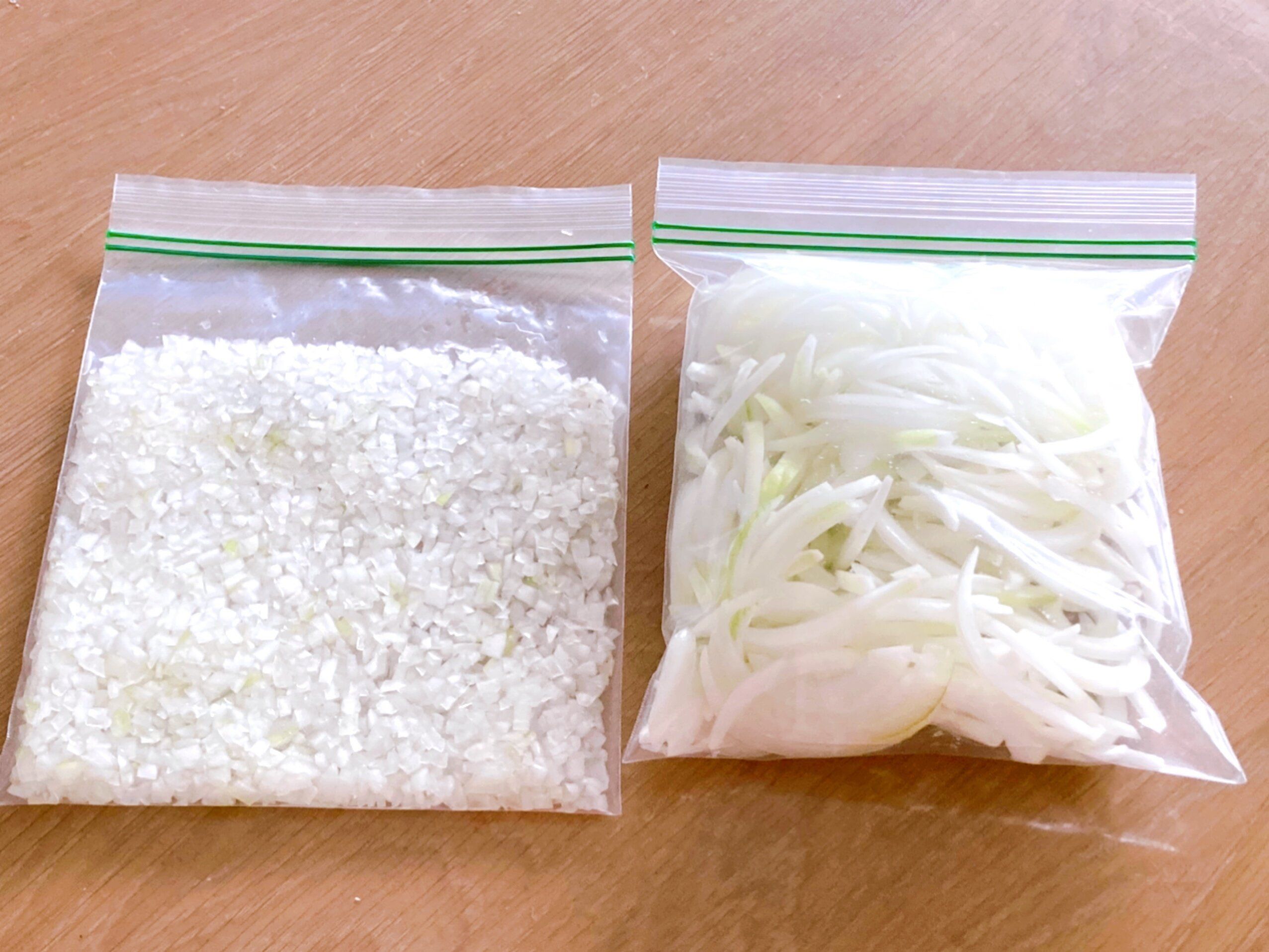 スライスだけでなく手間のかかるみじん切りも用意しておくと、いろんな料理で使えるのでとても重宝します。