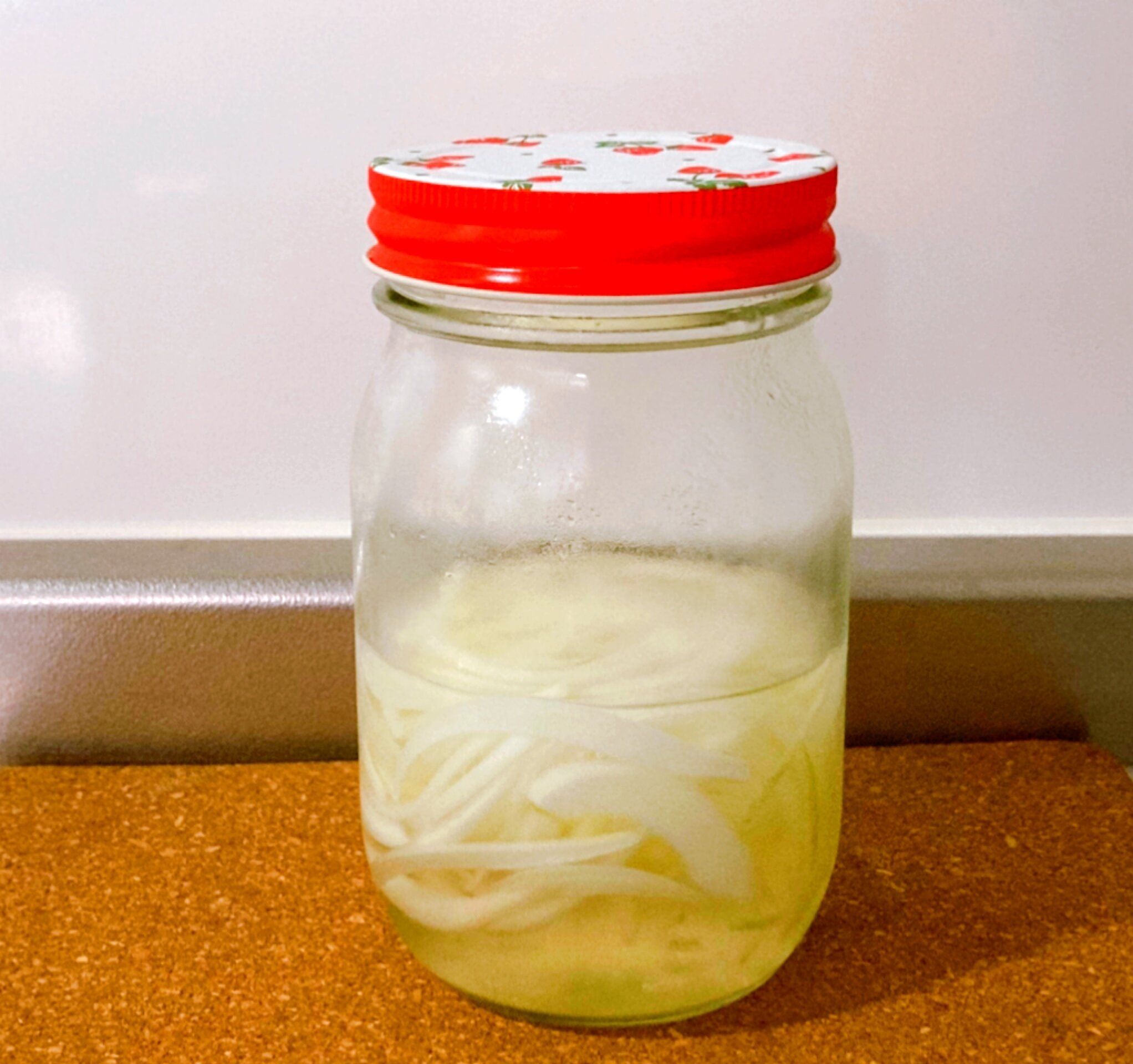 煮沸など消毒をした清潔な保存ビンに薄くスライスした玉ねぎとお好みのお酢を入れて冷蔵庫で保存するだけ。玉ねぎが空気に触れると傷んでしますので、【お酢は玉ねぎが漬かるぐらいたっぷりと入れる】のがポイント!