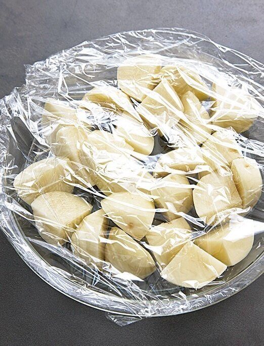 (1)鶏肉を焼き始め、じゃがいもをレンチン