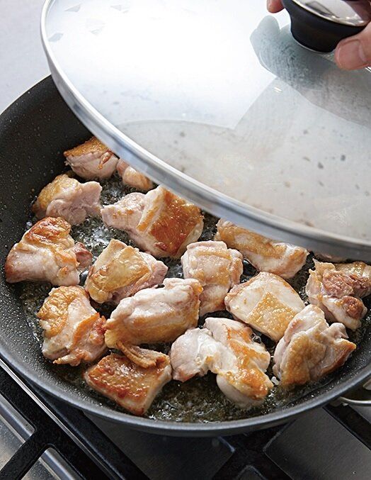 (1)の鶏肉にこんがりとした焼き色がついたら裏返して酒をふり、ふたをして弱めの中火で3~4分蒸し焼きにする。