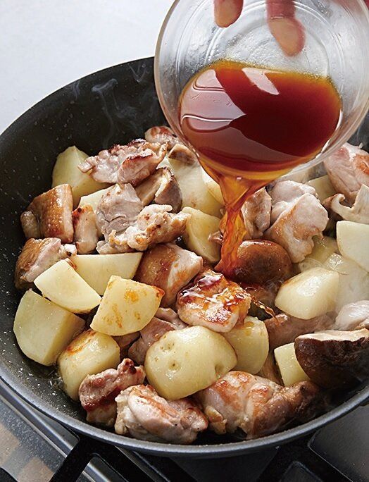 鶏肉は塩、こしょう各少々をふる。フライパンにサラダ油を熱し、鶏肉を皮目を下にして入れ、中火で焼き始める。じゃがいもは皮をむいて6~8等分に切り、耐熱皿にのせてラップを掛け、電子レンジで4~5分、竹串がスーッと刺さるようになるまで加熱する。しいたけは石づきを除いて半分に切る。たれの材料を混ぜ合わせる。