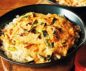 (2)ボウルに[A]を入れて混ぜ、(1)を加えてざっくり混ぜ、耐熱の器に入れて[B]をふる。