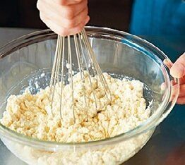 (2)粗熱を取ってボウルに入れ、泡立て器でつぶしながら混ぜる。[A]を加えてさらによく混ぜる。