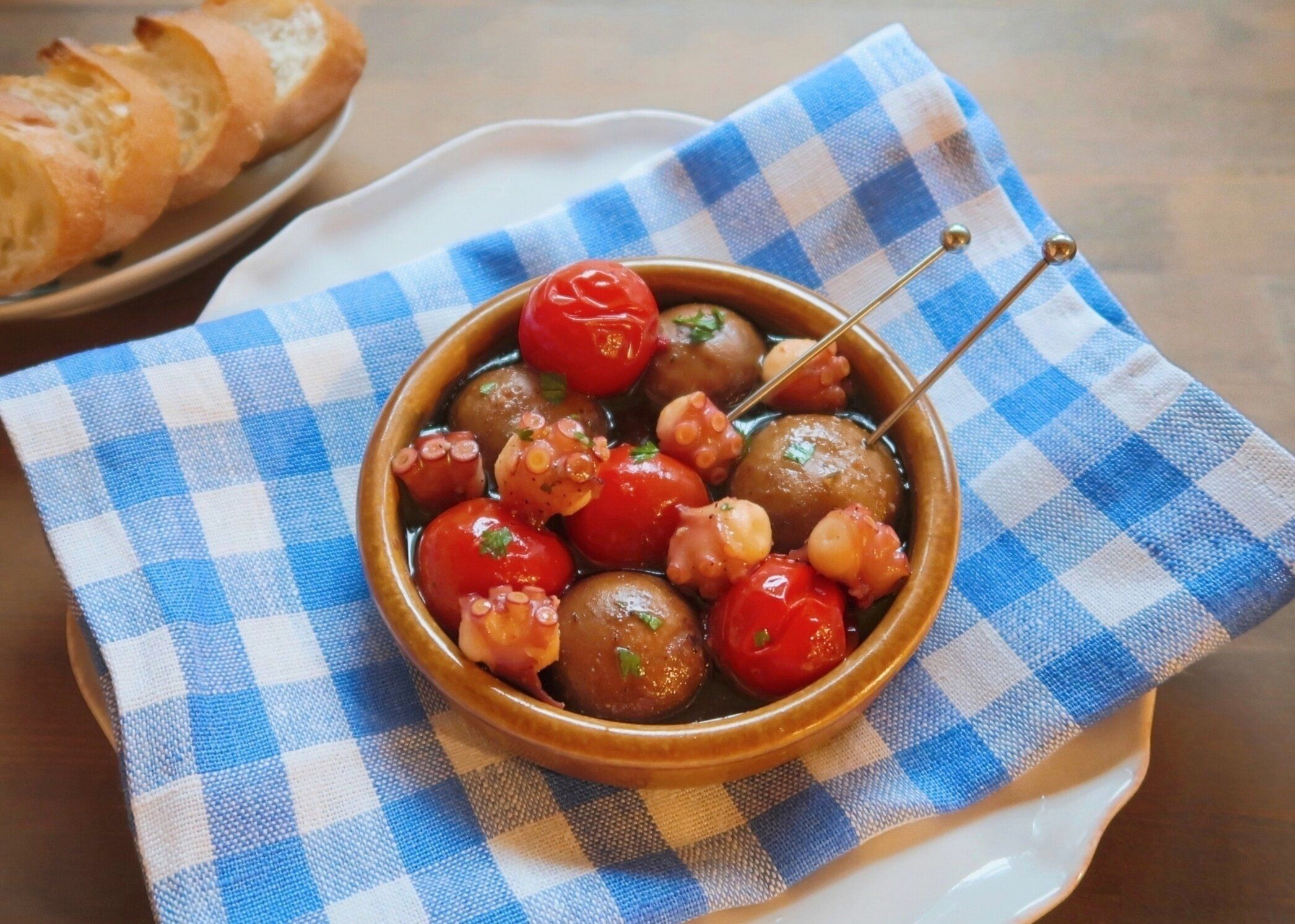 今回は、カルディのシーズニングを使った【タコとマッシュルームの本格アヒージョ】のつくり方をご紹介します。タコとマッシュルームの旨味と、ミニトマトのジューシーな味わいが口いっぱいにひろがります!