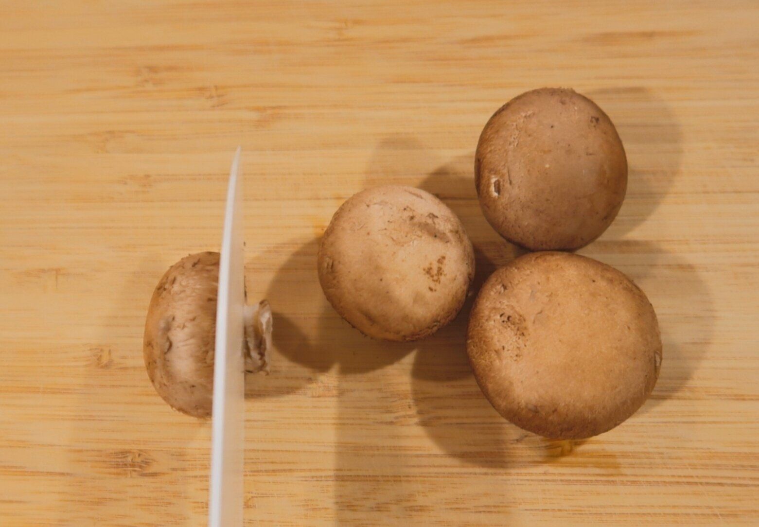 マッシュルームは洗わずに石づきを切り落とします。土などがついている場合は、湿らせたキッチンペーパーでふき取ります。