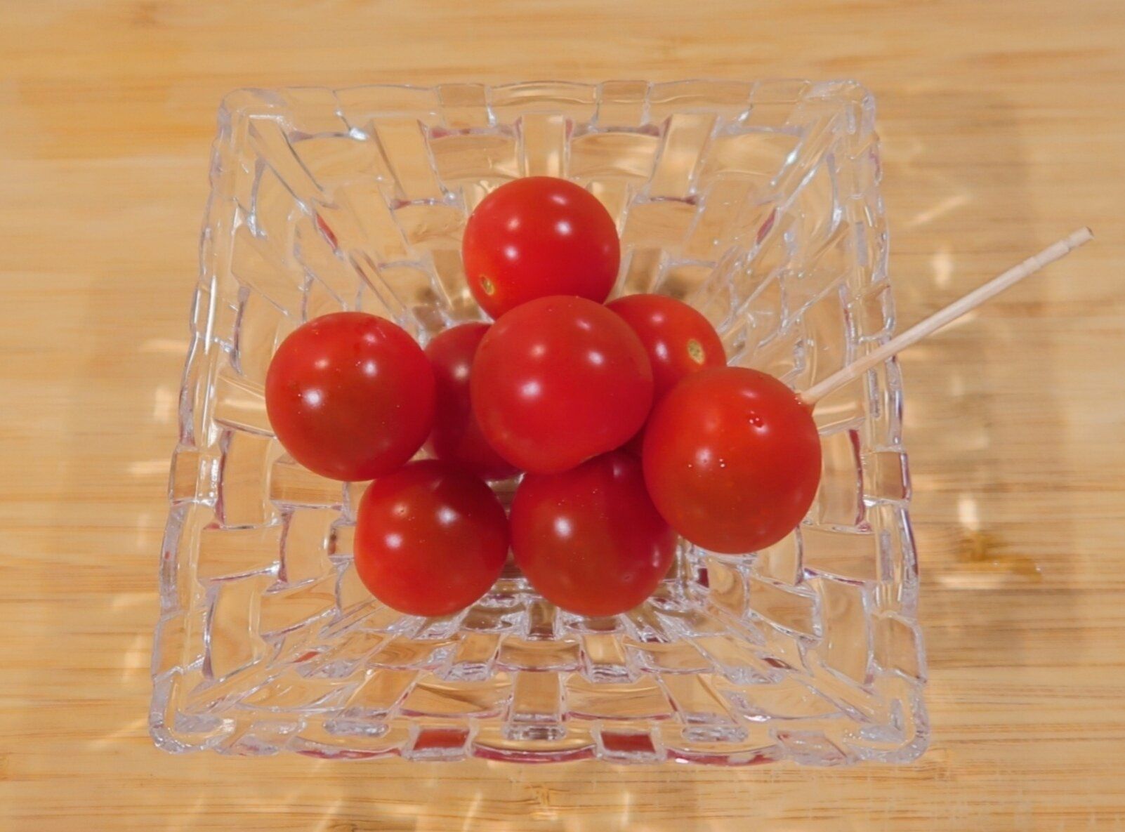 ミニトマトはヘタを取り除き、水洗いしてキッチンペーパーで水気をふきとります。つづいて爪楊枝で約3ヵ所に穴を開けます。