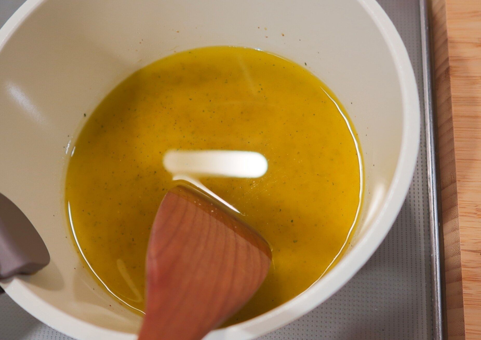 小鍋にオリーブオイル、アヒージョシーズニングを入れ、よく混ぜ合わせて溶かします。