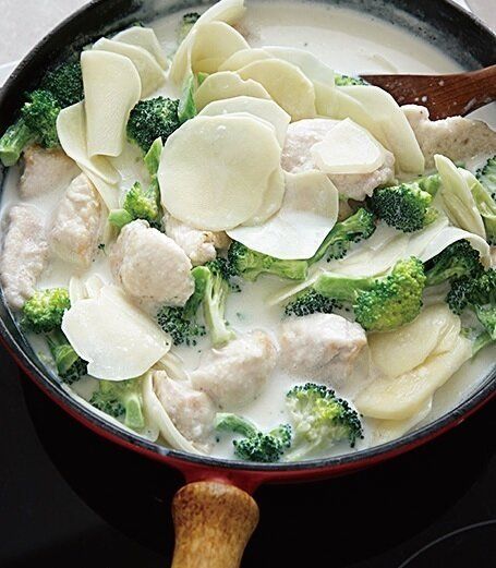 肉、緑黄色野菜、乳製品の組み合わせで栄養たっぷり。じゃがいものでんぷんでとろみが少しつくので、混ぜながら煮る。