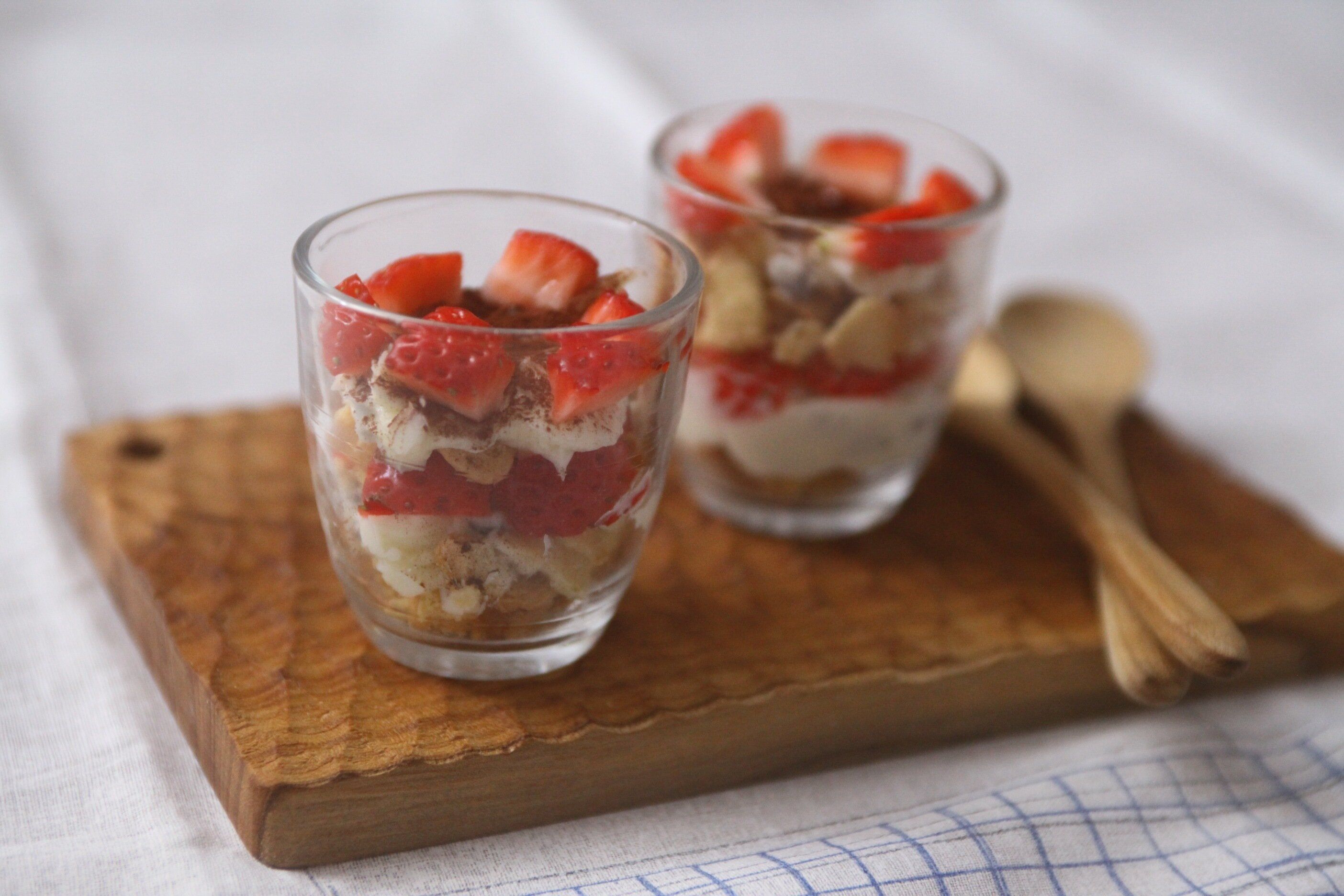 砕いたビスケット・クリーム・フルーツを交互に重ねた、おしゃれなカップパフェ。控えめな甘さと、ビスケットのサクサクとした軽い食感でいくらでも食べられそう♪工程も簡単なので、子どもといっしょにつくりたい一品です。