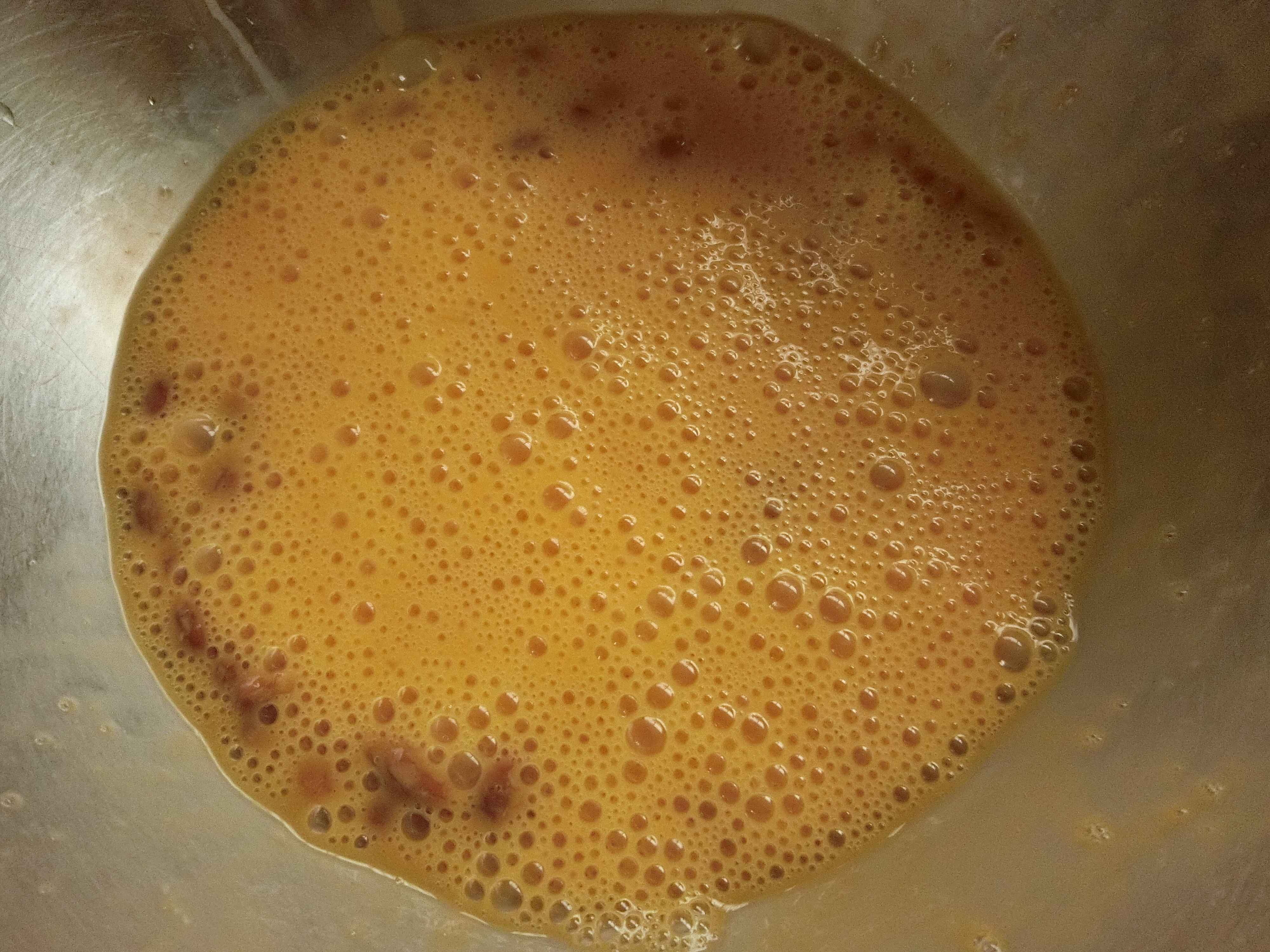 2.ごま油を入れたフライパンに流し入れて大きくかき混ぜたら、フタをして弱火で5~6分じっくり焼きます。