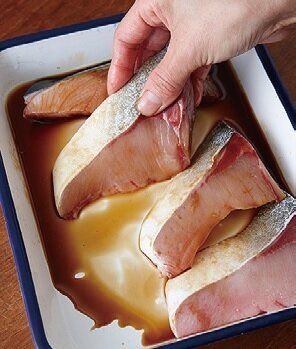 ぶりに、しょうゆと白ワイン(または酒)をもみ込めば臭みが抜け、手間や時間をかけなくても風味よく焼ける。