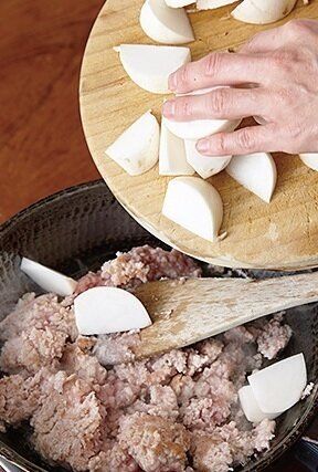 フライパンにごま油を入れて中火で熱し、ひき肉を入れ、広げて焼きつける。8割ほど焼けたら、ざっとほぐして炒め、(1)のかぶの実を加えて炒め合わせる。
