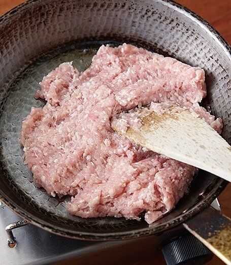 ひき肉は、ざっと広げて8割程度火が入るまでさわらずに焼きつければいいので、ほぐす手間はなし。