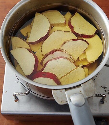 さつまいもは厚さ1cmの半月切りにして鍋に入れ、さつまいもがかぶるくらいまで揚げ油を注ぎ、中火にかける。