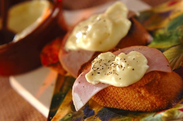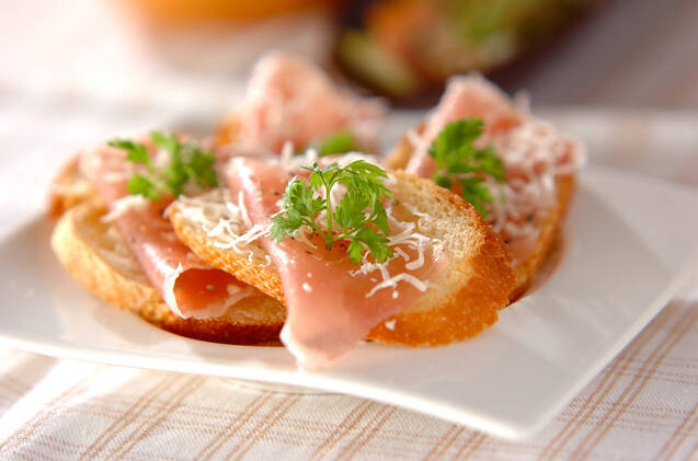 塩気と甘みをバランスよく味わえそうな、生ハムのせメープルラスク。おしゃれなおつまみや副菜にぴったりです。パルメザンチーズやコショウなどをかけていただきます!